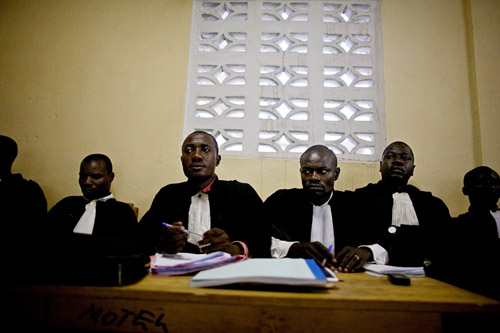 Defense attorneys listen to rape victims testify against their solider clients during a mass rape trial in the town of Baraka, Democratic Republic of Congo on February 16, 2011. Photo: Pete Muller