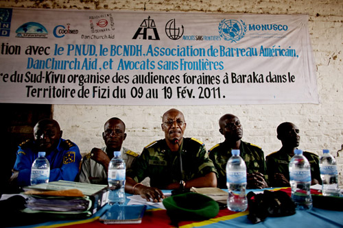 Lt. Col. Kebibi Mutware listens to arguments against him during a mass rape trial in Baraka, Democratic Republic of Congo on February 18, 2011. Photo: Pete Muller