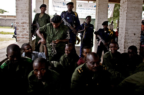 Prior to the start of a court session, a bailiff removes shackles from prisoners accused of crimes against humanity and rape in Baraka, February 17, 2011. Photo: Pete Muller