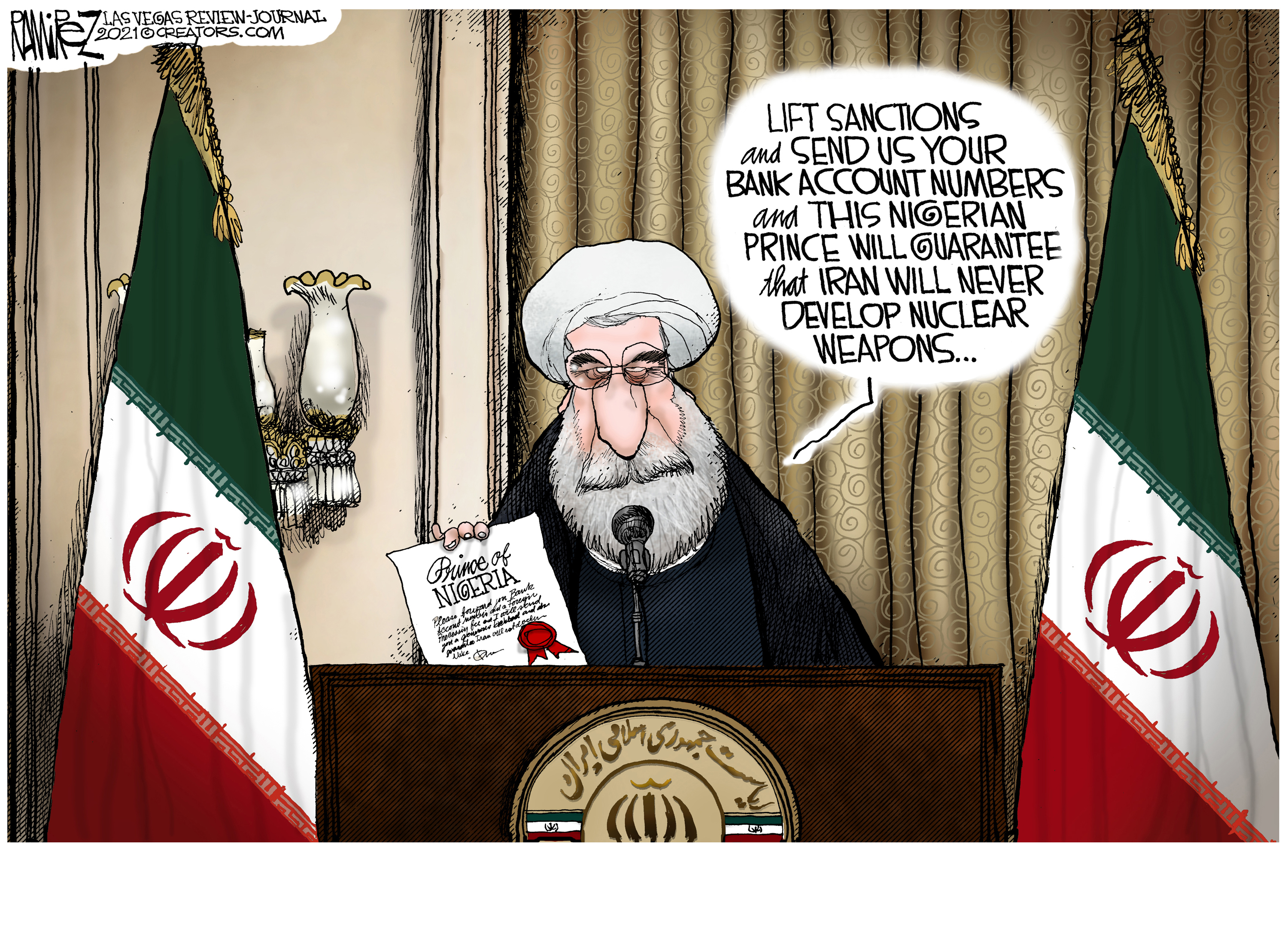 Michael Ramirez masterfully employs the full arsenal available to the visual satirist. He wields sharp caricature, pointed commentary, and slicing artistry with equal abandon. It is rare to find a cartoonist who deftly creates both dark moods and light humor with such skill and intelligence. His work effectively eviscerates sacred cows and makes us laugh, even as we sometimes grumble.