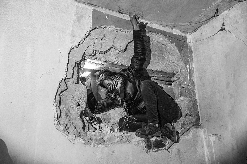 Guided by the smell of dead bodies, a man searches between the walls in Sednaya prison, on the outskirts of Damascus. Photo by Moises Saman