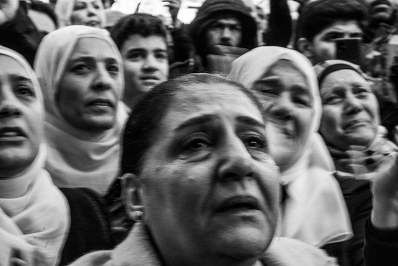 At a funeral ceremony for the activist Mazen al-Hamada, hundreds of relatives and sympathizers gathered to mourn and to project solidarity. His sister-in-law, Majida Kaddo (center), was unable to see him for years, before his remains were discovered near Damascus. Photo by Moises Saman