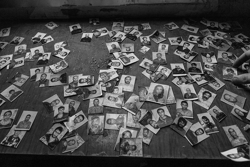Prisoner photos found at Palestine Branch prison, probably taken during intake or interrogations. For many, these may be the only remaining trace of their existence. Photo by Moises Saman