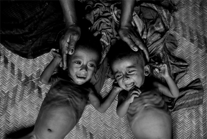 Malnourished and suffering from diarrhea, two Rohingya refugee children cry on the floor of a makeshift shelter at the Balukali refugee camp on September 27, 2017 in Cox's Bazar, Bangladesh. Photo: Kevin Frayer