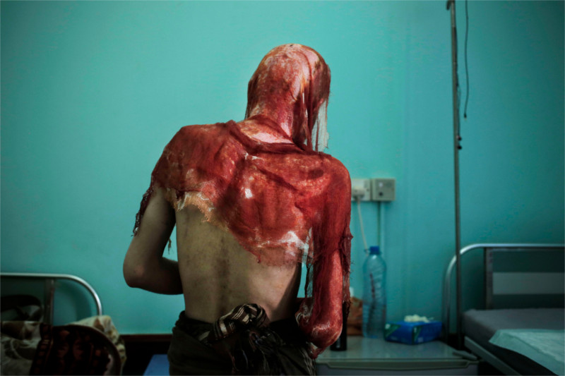 Monir al-Sharqi walks to his bed after nurses changed the dressings on his burns, at the Marib General Hospital in Yemen on July 25, 2018. Al-Sharqi, a lab technician, disappeared for a year, until he was dumped in a stream, half-naked, emaciated and bearing horrific marks of torture. He had burns from acid over his head, back and shoulders, so severe that his jacket stuck to his melted skin. Some members of his family believe he was detained and tortured by Yemen's Houthi rebels because of his past political activism. Photo: Nariman El-Mofty