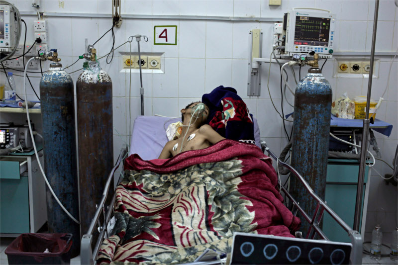 In this July 28, 2018 photo, 20 year-old Sakr Abd Mohammed, who was injured after a car accident rests in the ICU, at the General Hospital in Marib, Yemen. Photo: Nariman El-Mofty