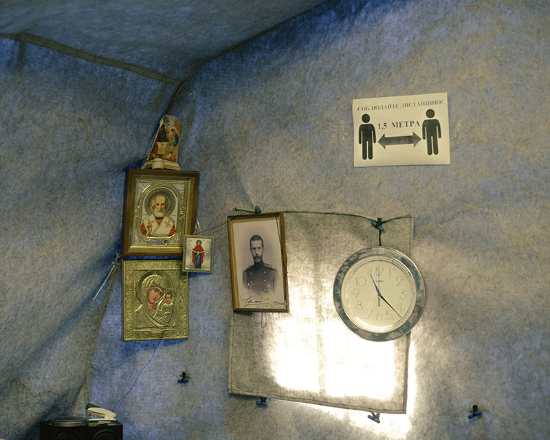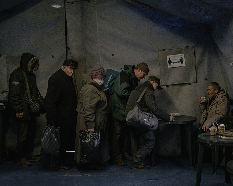 Inside a tented meal kitchen set up by an Orthodox church charity, homeless and other needy people line up to register for food and drink. Workers at the organization, whose Russian name translates to “Mercy,” say that numbers at this tent—one of many such service projects—have tripled since the onset of the pandemic. Photo: Nanna Heitmann