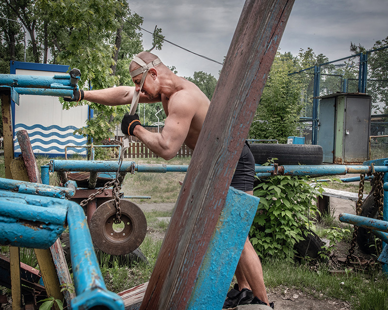 A man works out in Kachalka, an outdoor gym in the center of Kyiv made of scrap metal and other found objects, May 20, 2022. Built during the Soviet era, it is maintained by those who use it and is often called the world's most hardcore gym. People continue to work out here despite the war and recent attacks on Kyiv. Photo: Justyna Mielnikiewicz