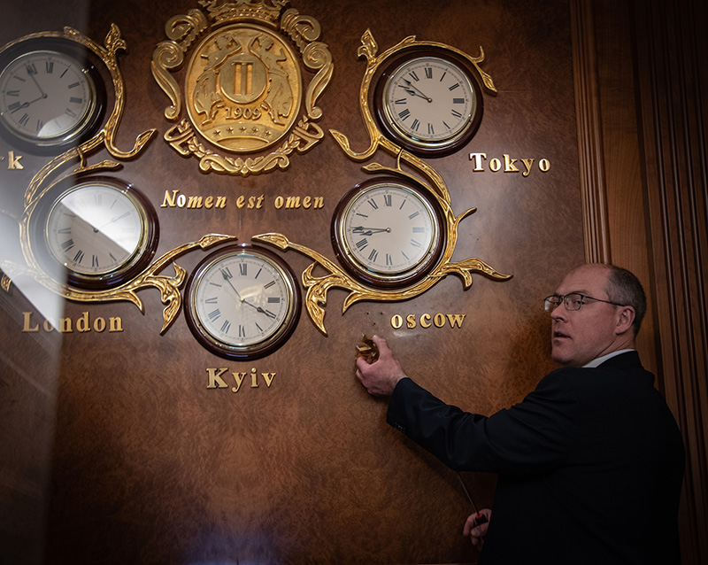 A worker in the luxury Kyiv Premier Palace Hotel removes 'Moscow' from one of the reception clocks, May 16, 2022. Photo: Justyna Mielnikiewicz