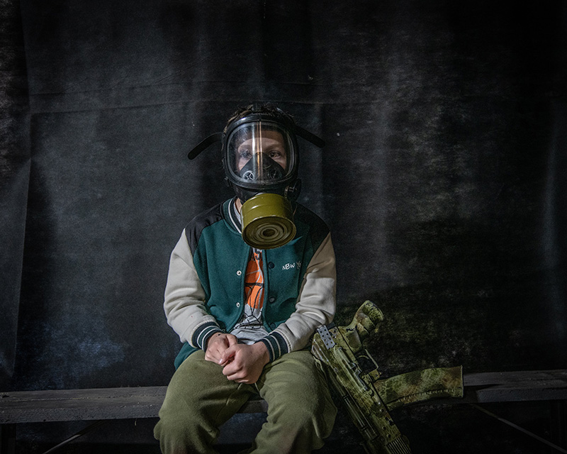 Mikhayl, the 9-year-old son of a member of the Zaporizhzhia Territorial Defense Unit, tries on a gas mask at the Military Sport Club Vognik in Zaporizhzhia, Ukraine, May 24, 2022. The school switched its operation to safety training for civilians and soldiers as well as becoming a volunteer center for collecting and providing a wide spectrum of the aid to soldiers following the Russian invasion. Photo: Justyna Mielnikiewicz