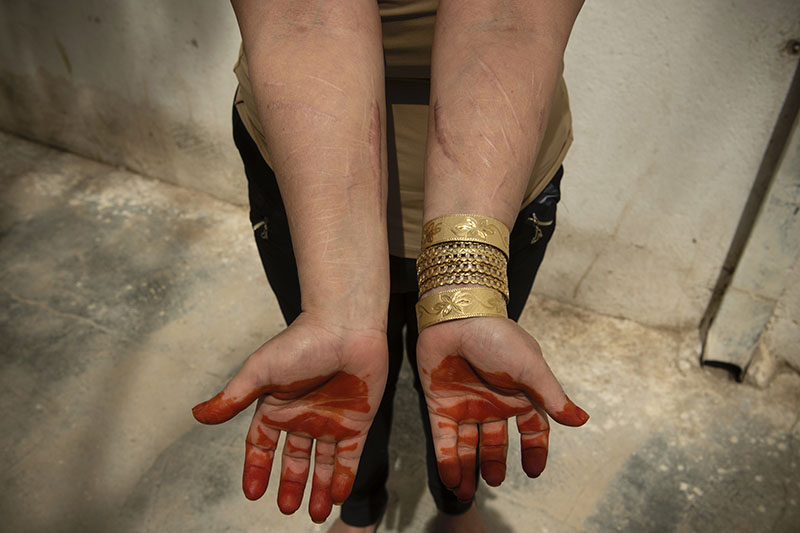 Nahid’s arms are covered with cuts that appear self-inflicted. Her fingers and palms are dyed with henna. “I am regretful despite how he tortured me,” she says through tears. “I wouldn’t have done this if he had gotten better. He was the father of my children.” Photo: Kiana Hayeri