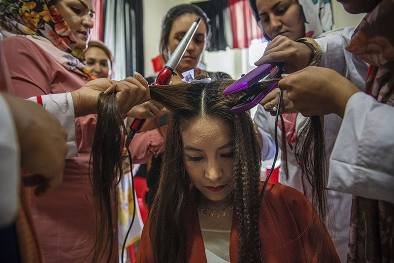 The inmates practicing hairstyling on a guard at a weekly cosmetic workshop. They learn trades and are paid small stipends for work like tailoring and babysitting. Subjects taught in the compound include sewing, makeup and hairstyling, baking and literacy. Photo: Kiana Hayeri