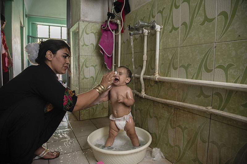 Parisa bathing her 1-year-old daughter, Fatima. Parisa, 20, arrived at the prison in 2018. She was married for about five years, during which time she was repeatedly beaten and stabbed by her husband. She said he would tie her up and beat her hands and feet with a thick piece of wood. Her husband threatened to kill her parents if she filed for a divorce. One night, she locked herself in a room in which she found her husband’s rifle and loaded it. She says she fired a shot through the door after her husband started screaming on the other side. The bullet struck him in the chest, and he died minutes later. Police took Parisa into custody, and after a brief investigation, she was tried, convicted and sentenced to 16 years in prison. Fatima and her 3-year-old son, Mohammad Irfan, were incarcerated with her. Photo: Kiana Hayeri