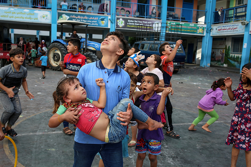 In a schoolyard, a boy carries his younger sister as children gaze skyward, as Israeli jets fly overhead. Photo: Samar Abu Elouf