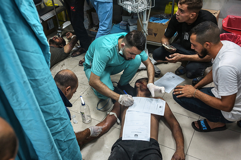 By Oct. 24, the overburdened Gazan health system was in a dire state. Medics treat a patient on the hospital floor, after failing to find him a bed. Before the war, the hospital used to treat a maximum of 700 patients a day. Now, there were more than 2,000 inside. Photo: Samar Abu Elouf