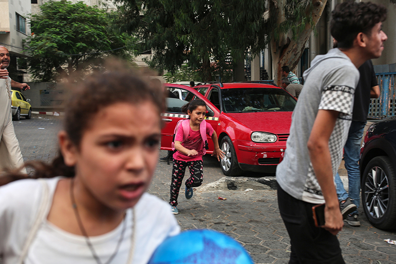 On Oct. 9, the sound of new strikes tore through the air outside the Shifa hospital in Gaza City. Two young girls sprint for shelter. Photo: Samar Abu Elouf