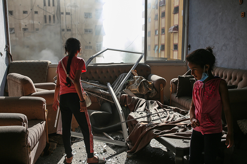 Two girls survey damage in their family home on Oct. 7. Hours earlier, one of the first Israeli airstrikes had flattened the building next door, shattering windows in adjacent structures. Photo: Samar Abu Elouf