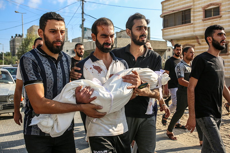 Members of the Al-Majaida family carry a child during a funeral on Oct. 19 in Khan Younis, southern Gaza. Photo: Samar Abu Elouf