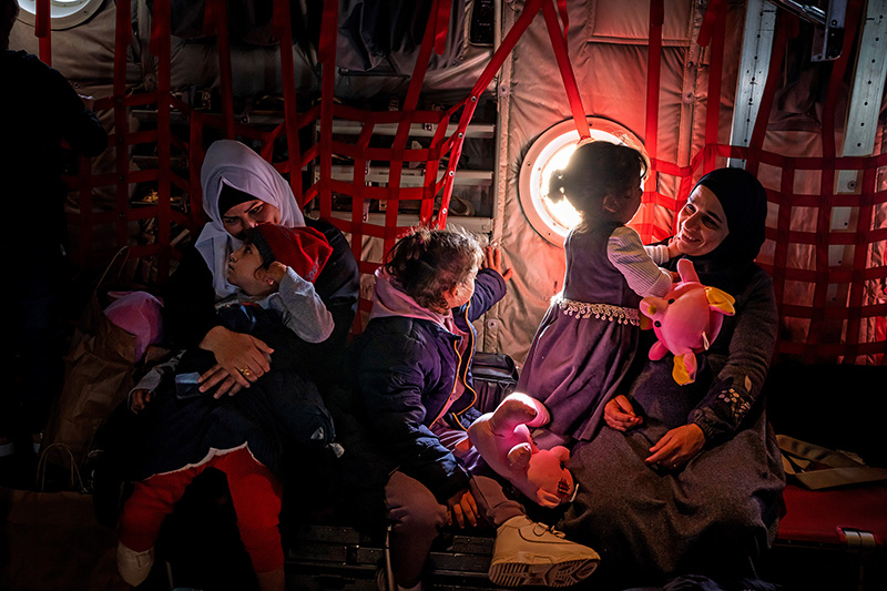 Sarah Yusuf, 5, stared out the window of an airplane during an Italian military airlift evacuating injured children from Gaza. On right, her cousin and caretaker, Niveen Foad, held her daughter, Rugia. At left, Shaymaa Shady, 5, whose foot was amputated in Gaza, nestled in the arms of her aunt, Lina Gamal. Photo by Nariman El-Mofty for The New York Times
