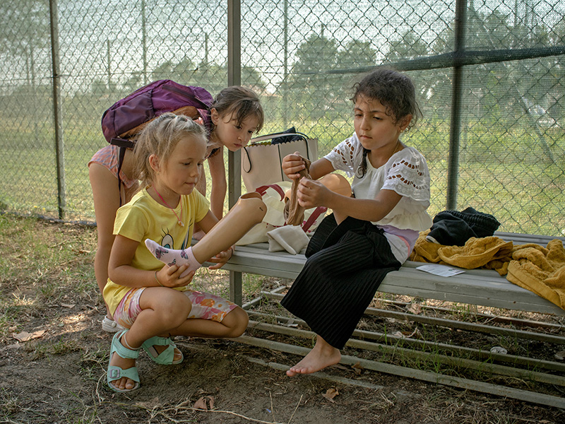 Shaymaa was evacuated to Italy for treatment. At summer camp, she adjusted her prosthetic leg with the help of a friend. Photo by Laura Boushnak for The New York Times