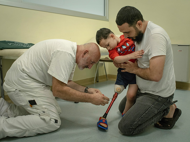 Four-year-old Ahmad Al Saafen lost his leg in an Israeli airstrike. Italian doctor Luca Dalmastri, left, adjusted the prosthetic while Ahmad’s father, Montaser Al Saafen, 35, held his son. Photo by Laura Boushnak for The New York Times