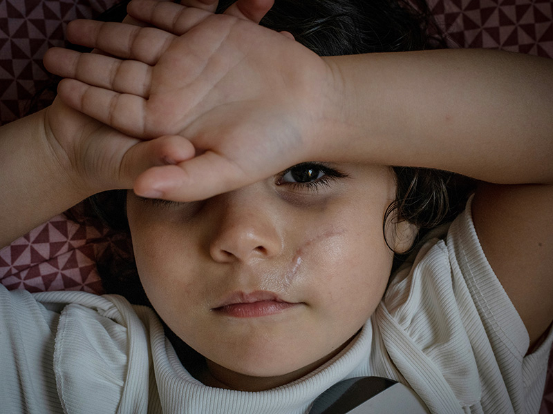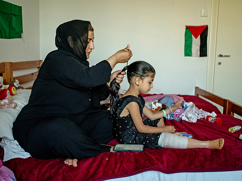 Baian Azoum, 4, was pulled from the rubble after a December 2023 attack on Gaza with wounds to her head, broken teeth and a fractured leg. She has nearly two years of treatment ahead of her. Photo by Laura Boushnak for The New York Times