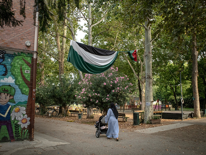 Fatma Hasanain, 32, Baian’s aunt, came with her to Italy as her caretaker because Baian’s parents were dead, but had to leave her own daughter behind in Gaza. She walked Baian to her first day of summer camp in July. Photo by Laura Boushnak for The New York Times