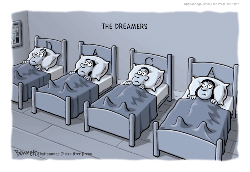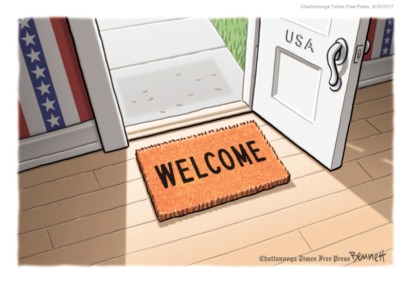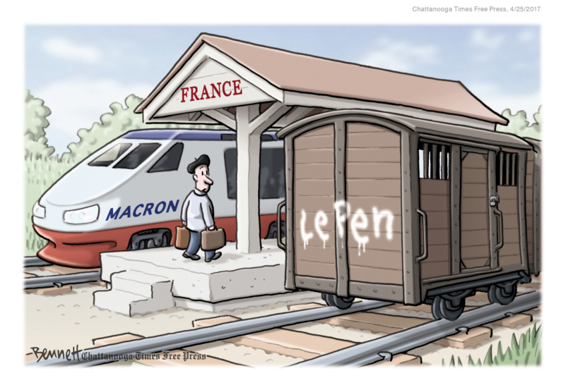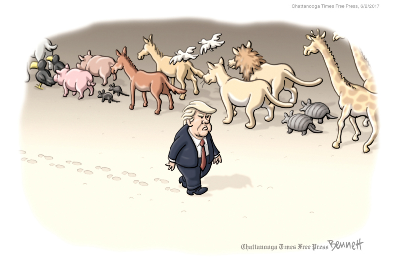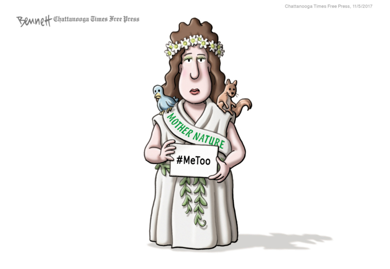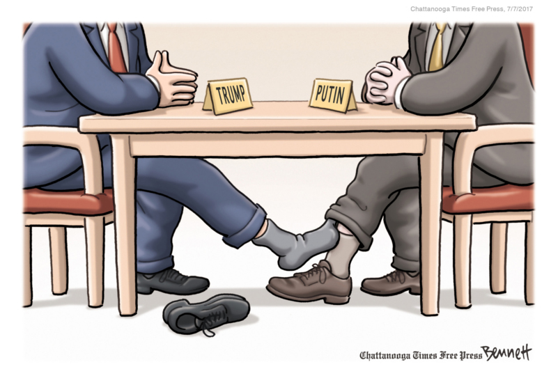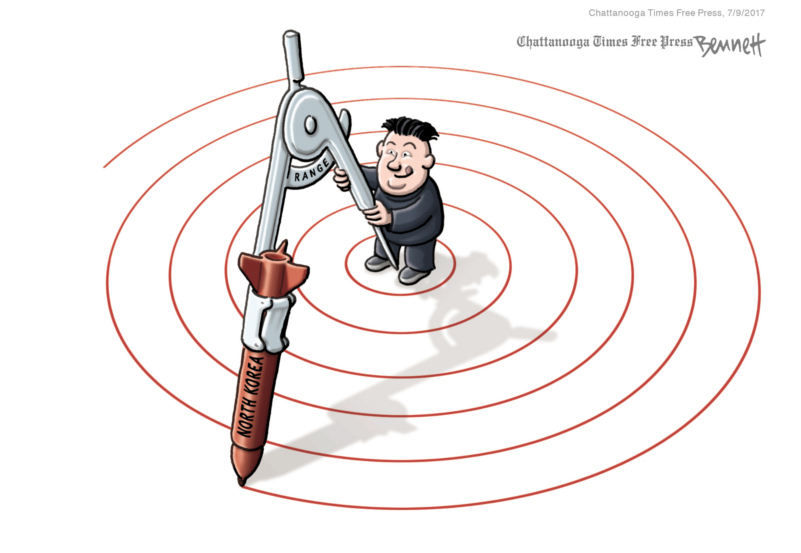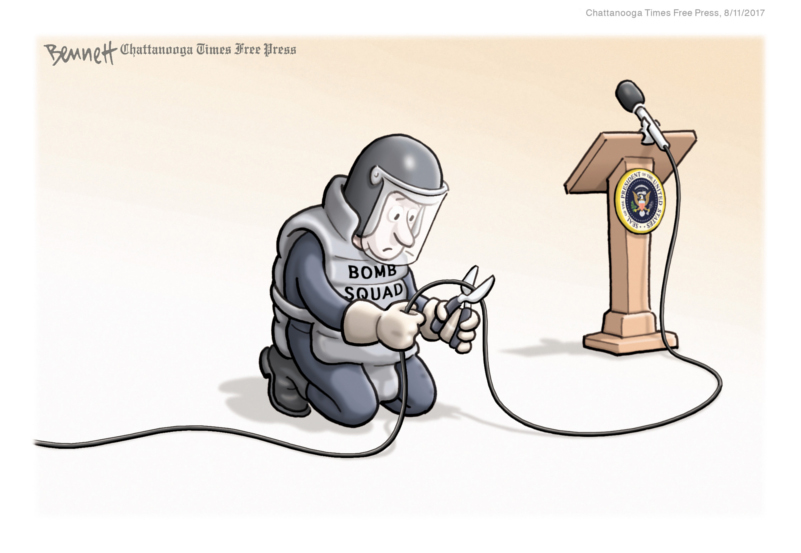 Clay Bennett’s deceptively simple cartoons, often without captions, drive home strong, perceptive messages on topics ranging from global warming, immigration, North Korea’s nuclear program and Vladimir Putin, to Donald Trump’s handling of complex foreign policy issues. Clever ideas and an engaging style make for a memorable portfolio.